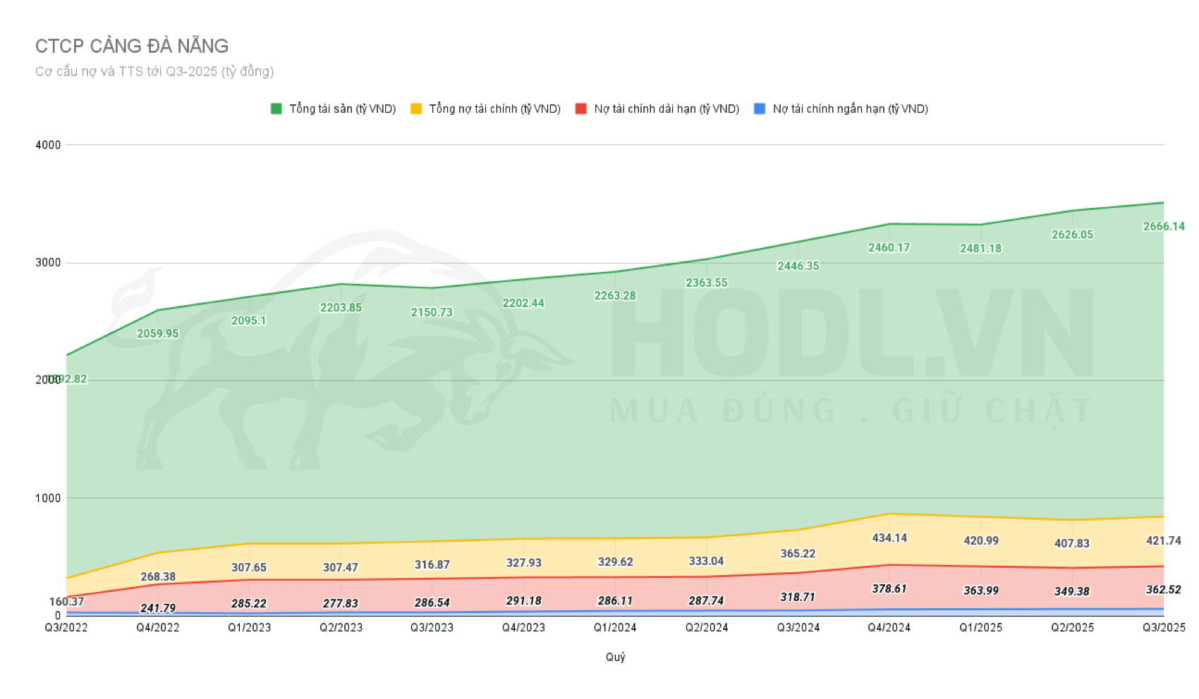 Nợ phải trả tăng từ 629.7 tỷ đồng đầu năm lên 686.6 tỷ đồng (tăng 9.0%), chủ yếu do nợ dài hạn tăng để tài trợ dự án Logistic Hòa Vang. Tuy nhiên, tốc độ tăng nợ thấp hơn tốc độ tăng VCSH (8.2%), cho thấy công ty ưu tiên tài trợ bằng nguồn vốn tự có.