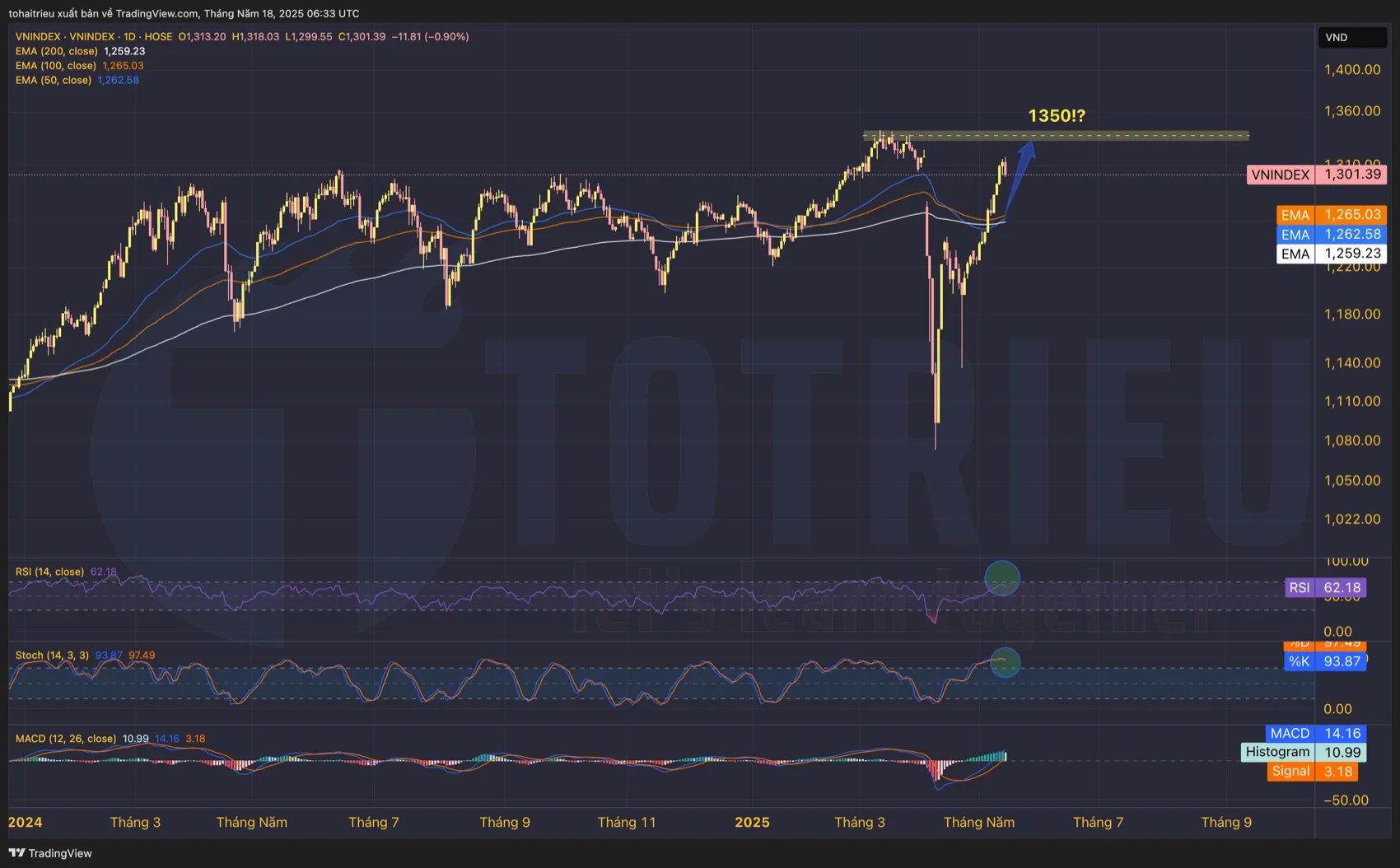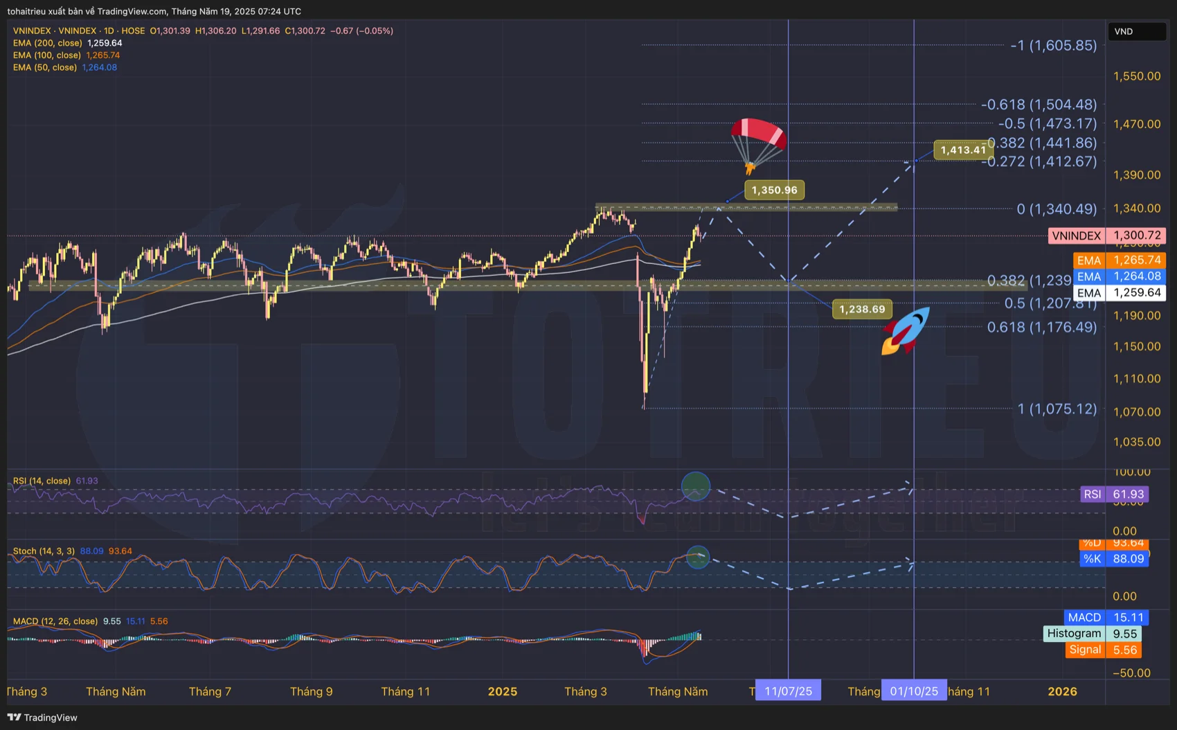 Dưới đây là biểu đồ kỹ thuật chỉ số VNINDEX: