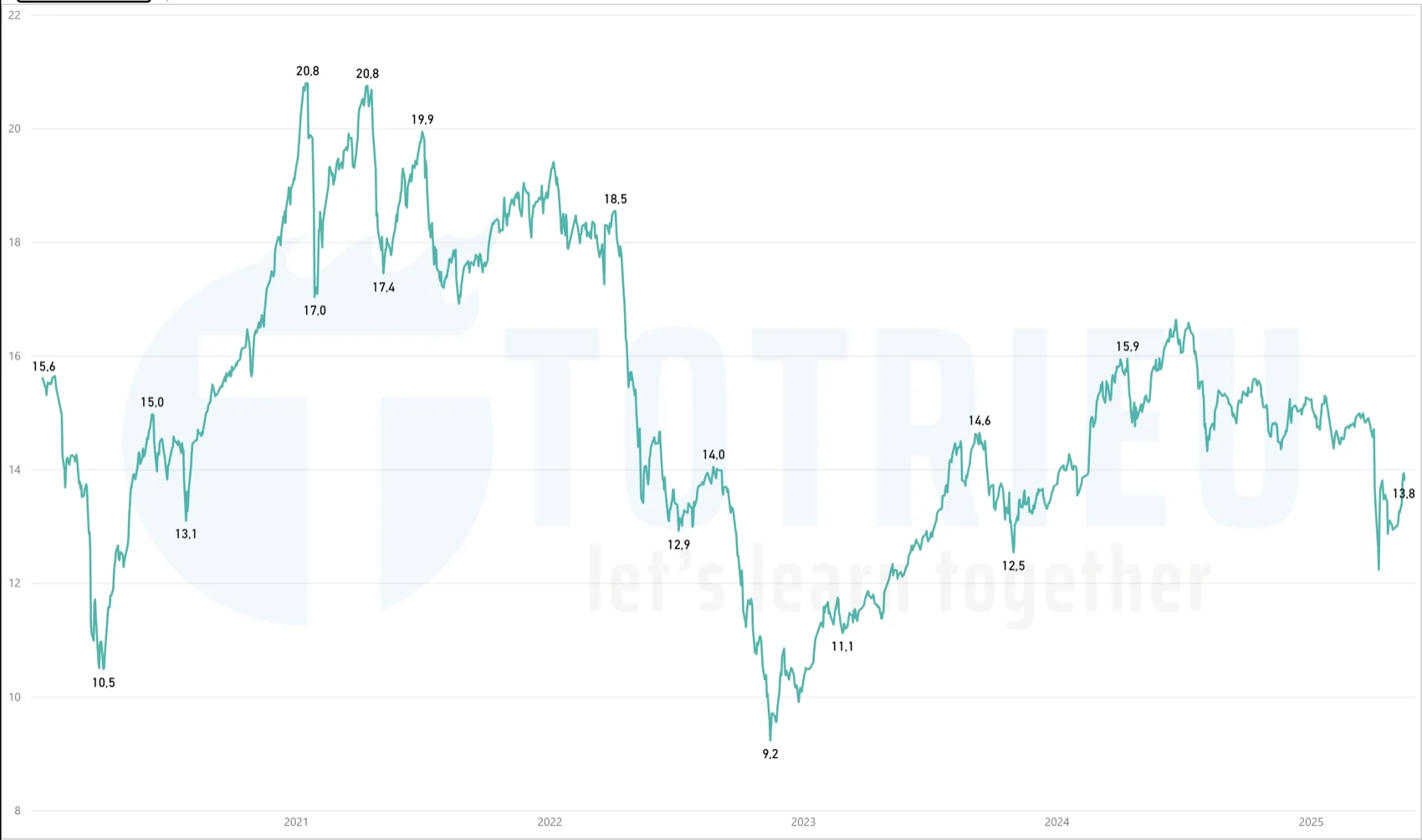 P/E của VNINDEX đang ở ngưỡng 13.8 lần khá thấp và tiềm ẩn động lực để có thể tiếp tục đánh lên. Trong quá khứ, Tôi nhận thấy ở ngưỡng P/E này VN-INDEX ít bị giảm mạnh. Nhưng khi P/E đạt ngưỡng khoảng 14.6 – 15.0 lần thì VNINDEX hay xuất hiện một đợt điều chỉnh lớn: