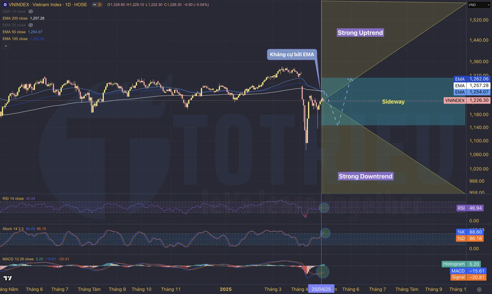 Giai đoạn 1: Tháng 05/2025, Chúng tôi kỳ vọng VN-INDEX tiếp tục đà phục hồi và tiến tới ngưỡng 1262 – 1280 điểm.
